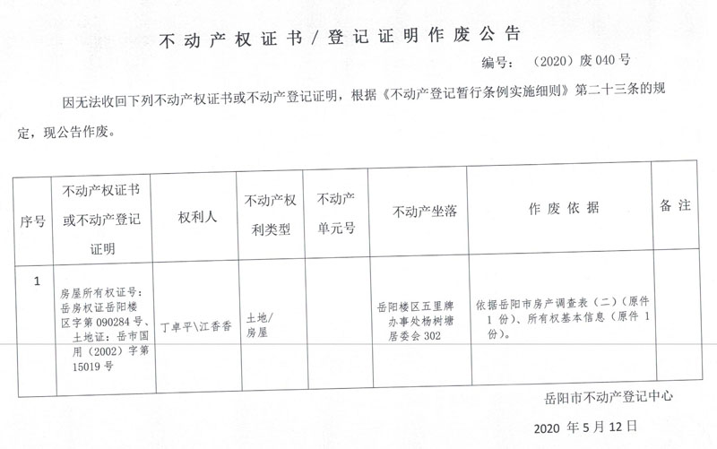 不动产权证书/登记证明作废公告(丁卓平/江香香)