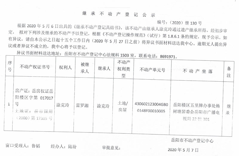 继承(受遗赠)不动产登记公告(涂克玲)
