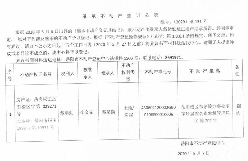 继承(受遗赠)不动产登记公告(戴绪勤)