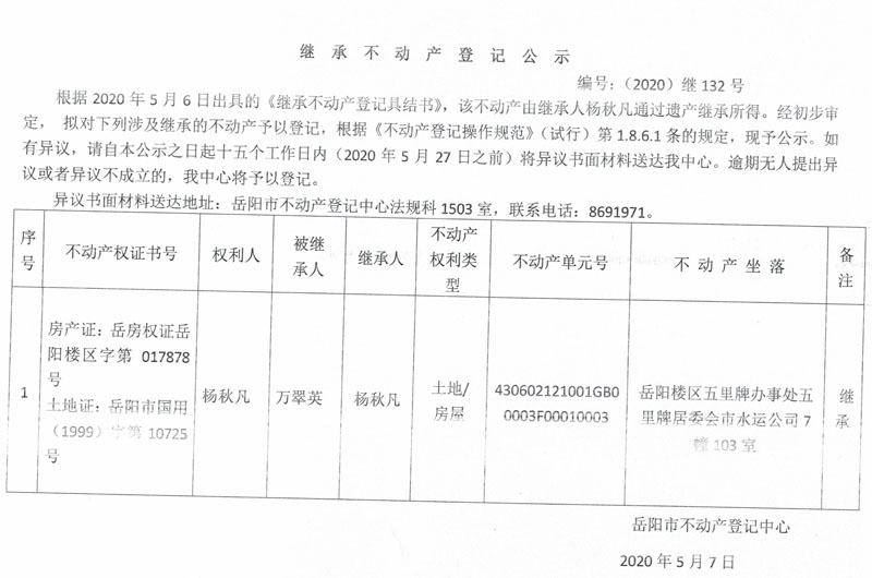 继承(受遗赠)不动产登记公告(杨秋凡)