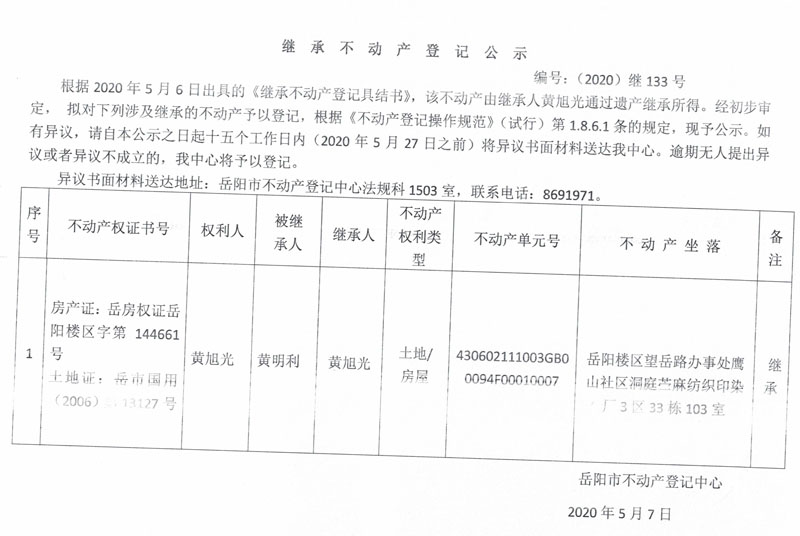 继承(受遗赠)不动产登记公告(黄旭光)