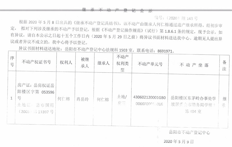 继承(受遗赠)不动产登记公告(何仁榕)
