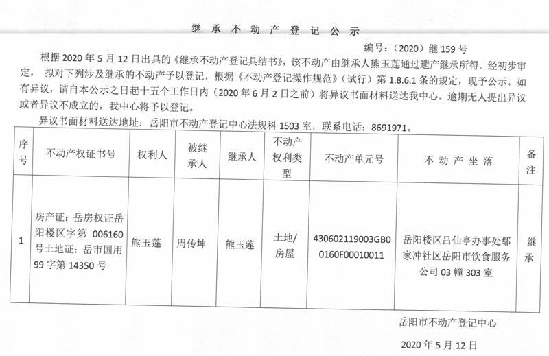 继承(受遗赠)不动产登记公告(熊玉莲)