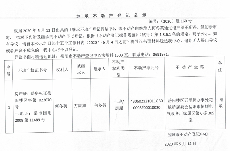 继承(受遗赠)不动产登记公告(何冬英)