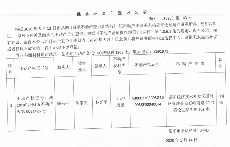 继承(受遗赠)不动产登记公告(杨乐平)