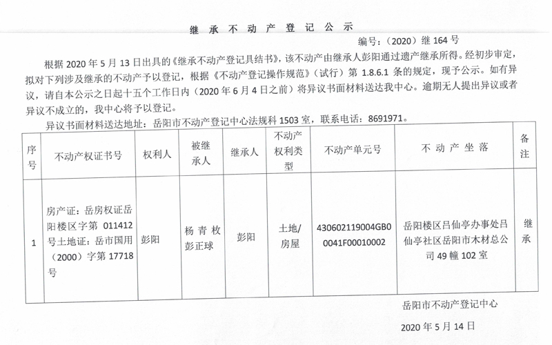 继承(受遗赠)不动产登记公告(彭阳)