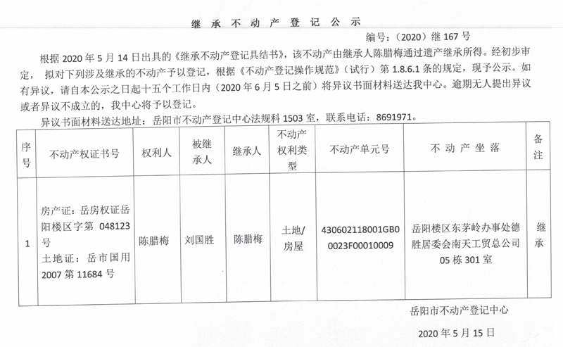 继承(受遗赠)不动产登记公告(陈腊梅)