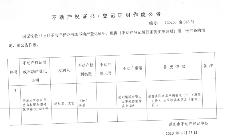 不动产权证书/登记证明作废公告(杨红卫、袁艺)