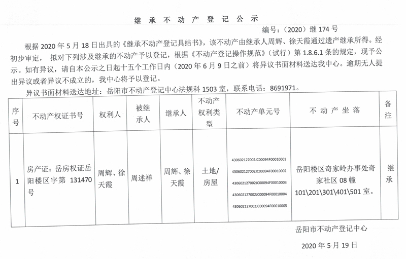 继承(受遗赠)不动产登记公告(周辉)