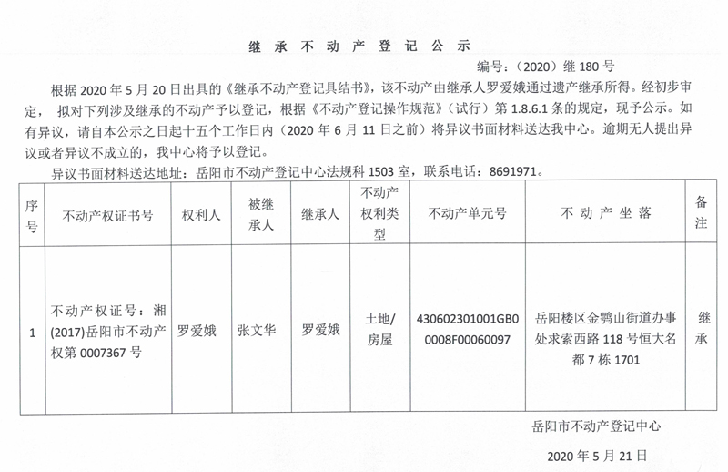 继承(受遗赠)不动产登记公告(罗爱娥)