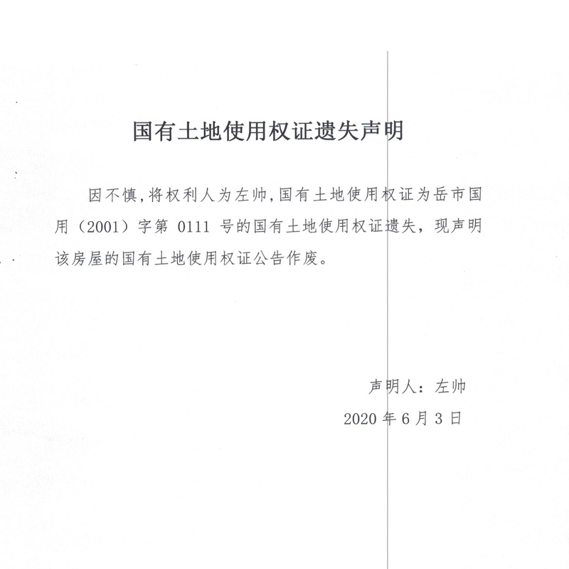 房屋所有权证、国有土地使用权证遗失声明(左帅)