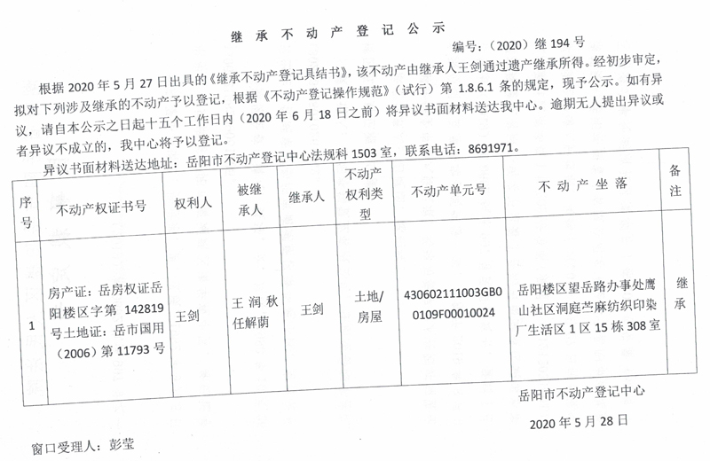 继承(受遗赠)不动产登记公告(王剑)
