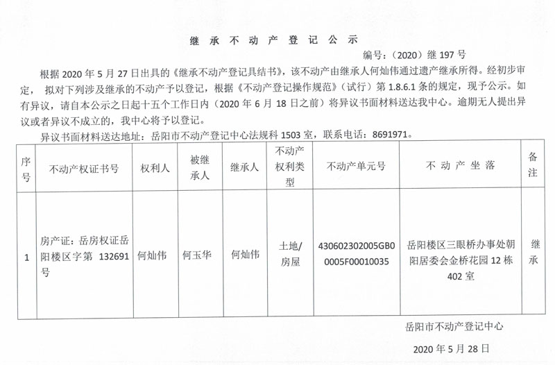 继承(受遗赠)不动产登记公告(何灿伟)