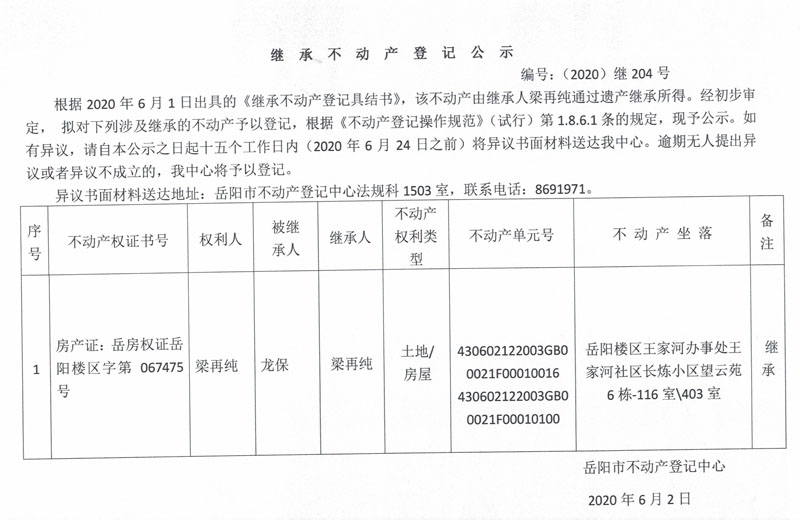 继承(受遗赠)不动产登记公告(梁再纯)