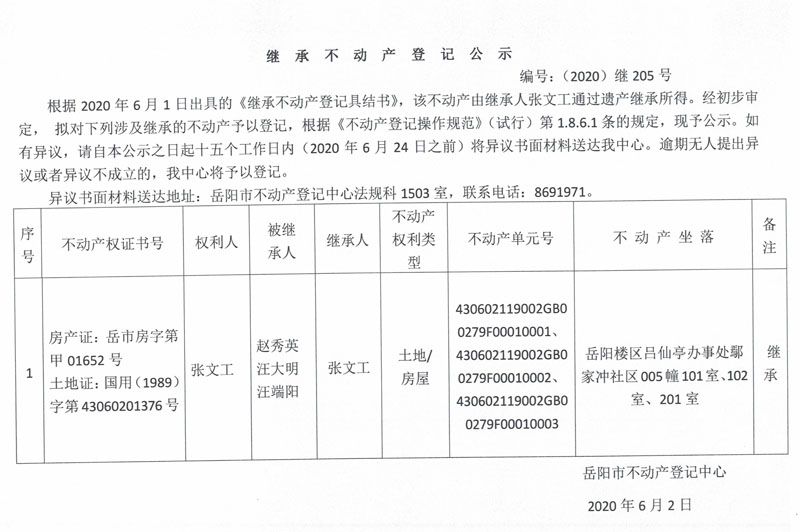 继承(受遗赠)不动产登记公告(张文工)