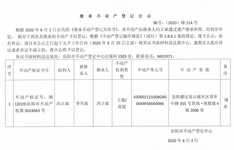 继承(受遗赠)不动产登记公告(冯立斌)