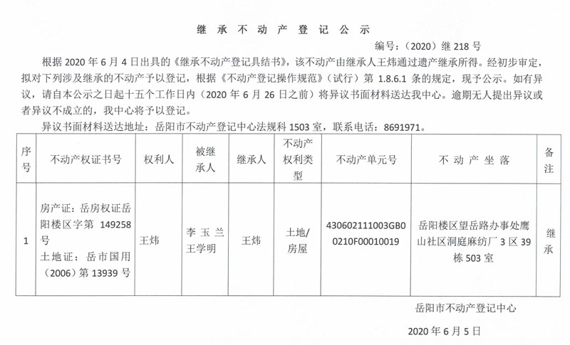 继承(受遗赠)不动产登记公告(王炜)