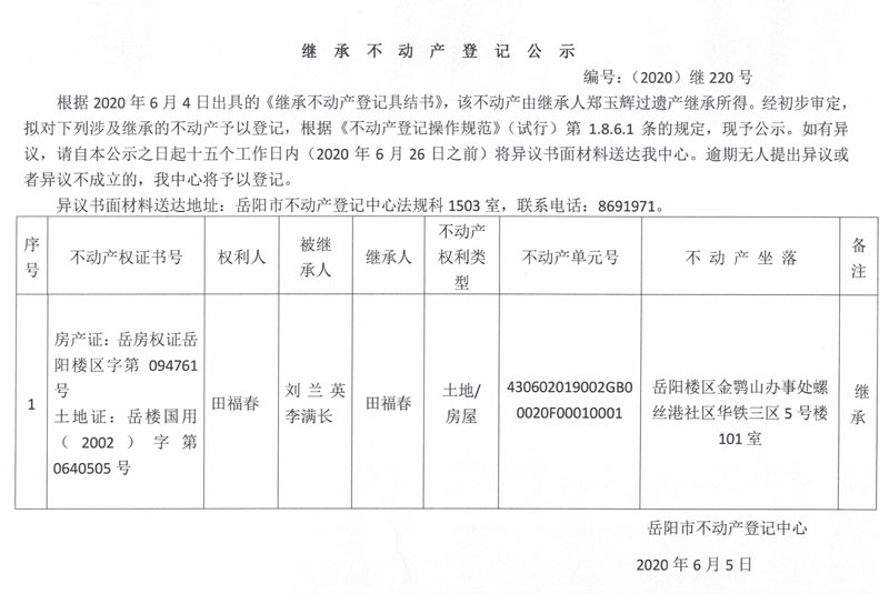 继承(受遗赠)不动产登记公告(田福春)