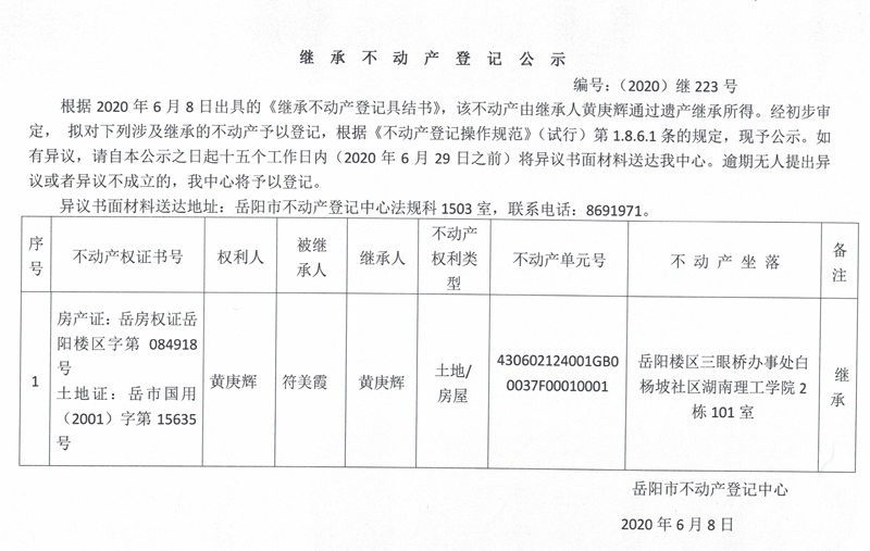 继承(受遗赠)不动产登记公告(黄庚辉)