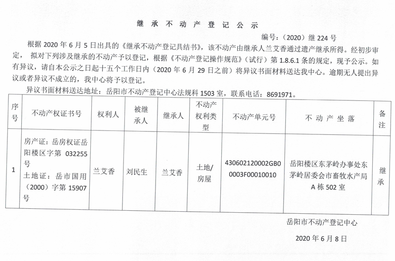继承(受遗赠)不动产登记公告(兰艾香)