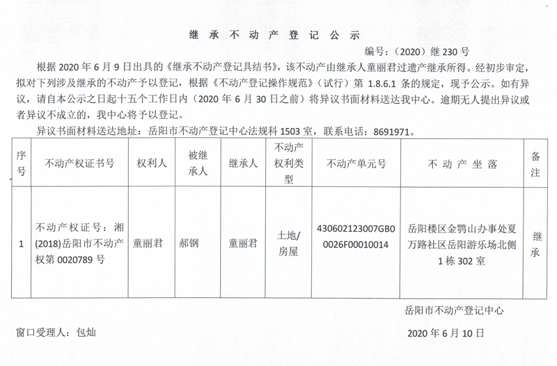 继承(受遗赠)不动产登记公告(童丽君)