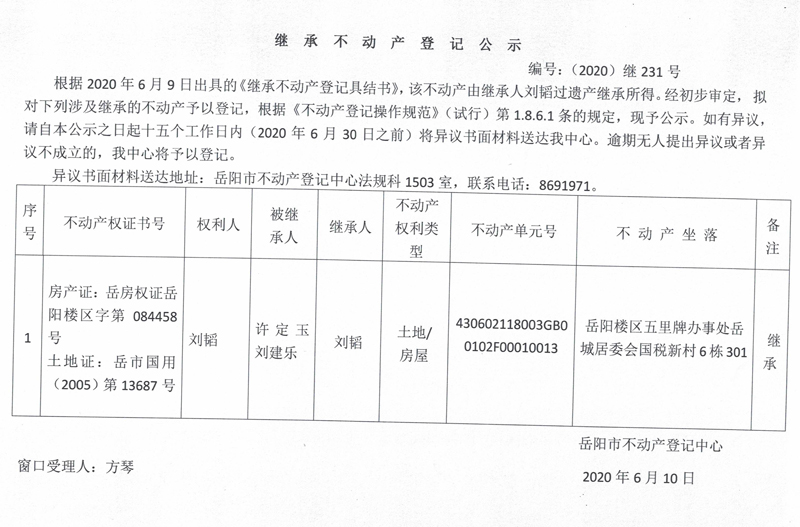 继承(受遗赠)不动产登记公告(刘韬)编号:(2020)继231号