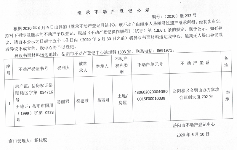 继承(受遗赠)不动产登记公告(易丽君)