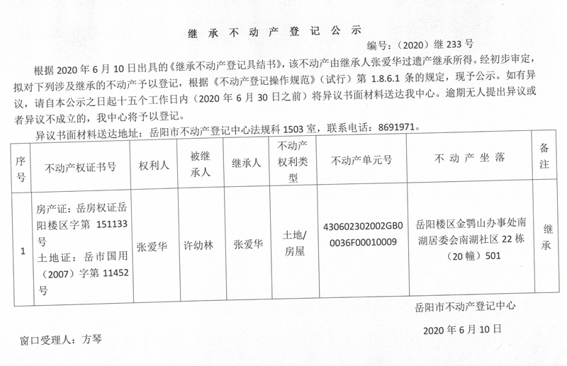 继承(受遗赠)不动产登记公告(张爱华)
