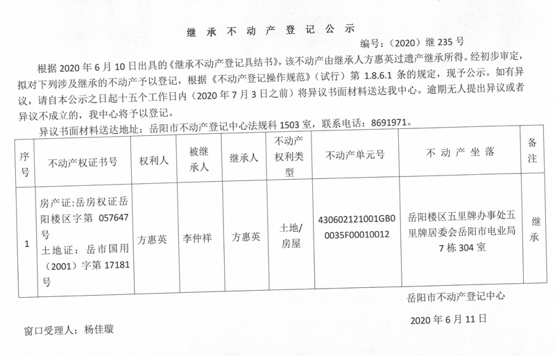 继承(受遗赠)不动产登记公告(方惠英)