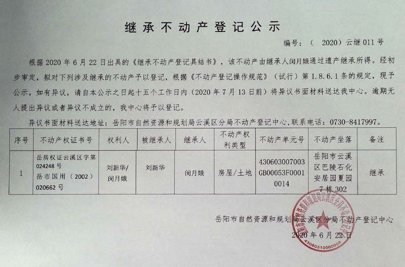 继承(受遗赠)不动产登记公告(刘新华、闵月娥)