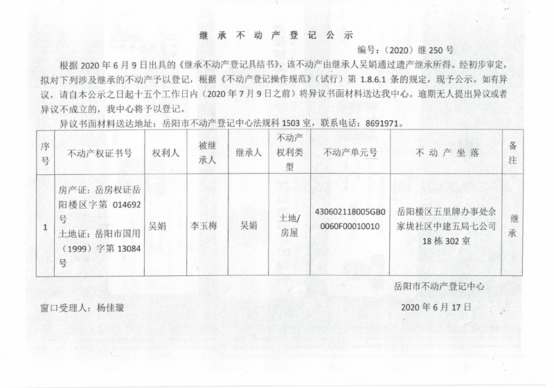 继承(受遗赠)不动产登记公告(吴娟)