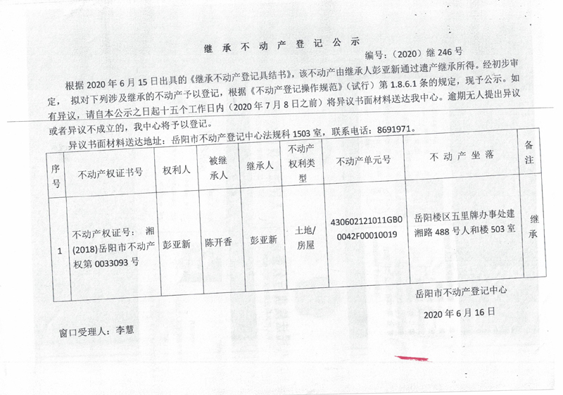 继承(受遗赠)不动产登记公告(彭亚新)