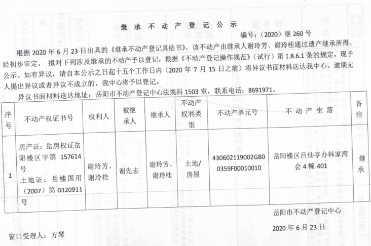 继承(受遗赠)不动产登记公告(谢玲桂)
