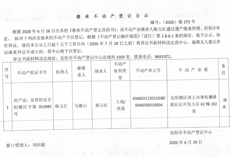 继承(受遗赠)不动产登记公告(杨玉红)