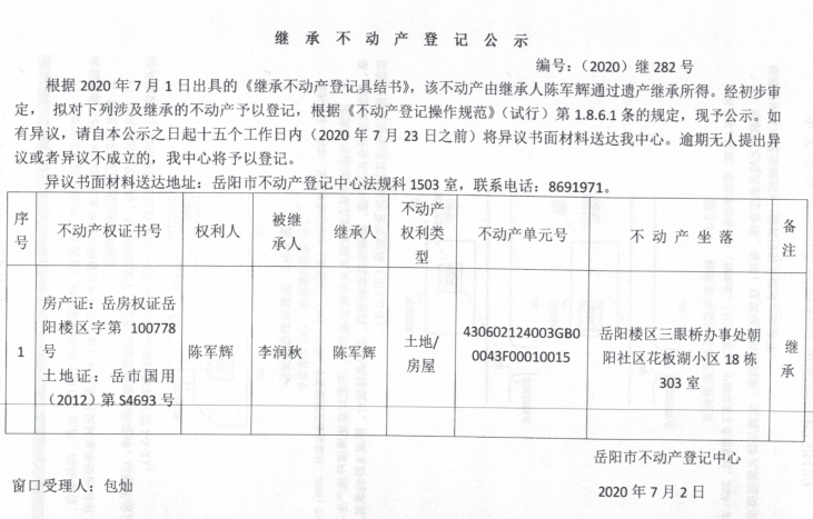 继承(受遗赠)不动产登记公告(陈军辉)