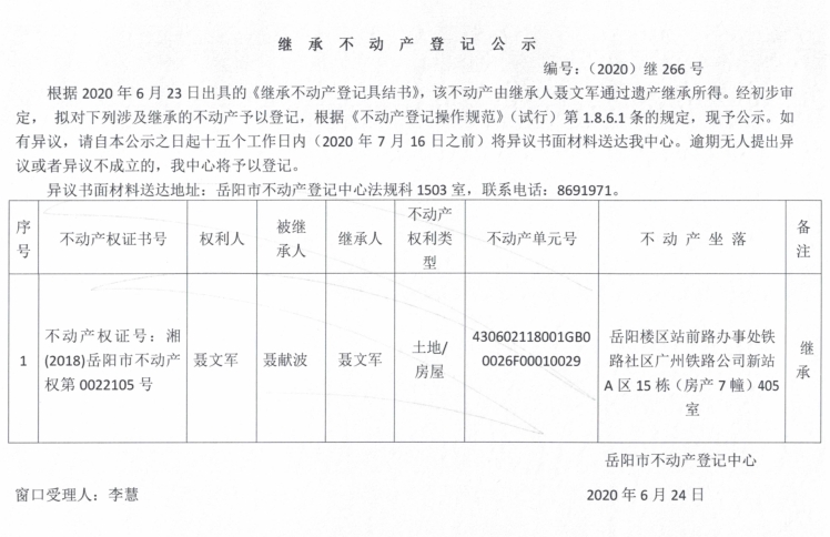 继承(受遗赠)不动产登记公告(聂文军)