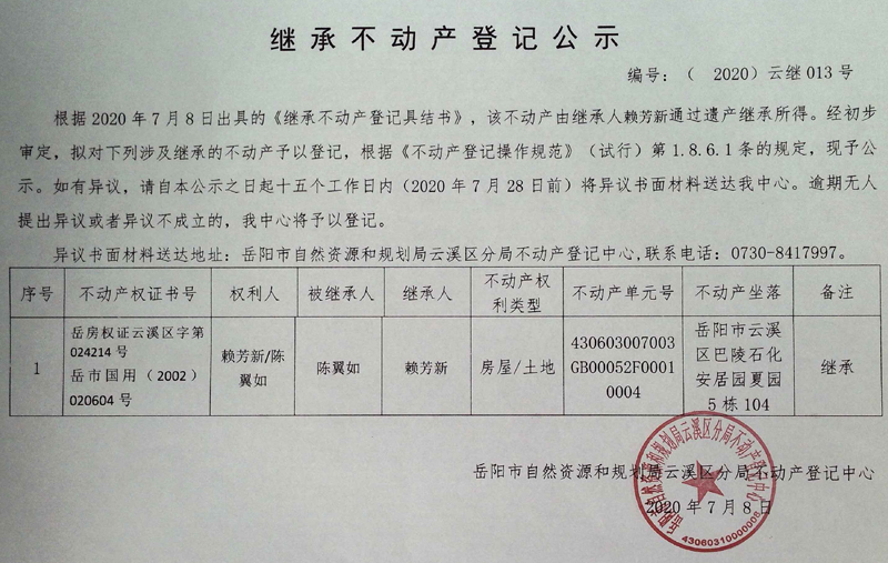 继承(受遗赠)不动产登记公告(赖芳新)