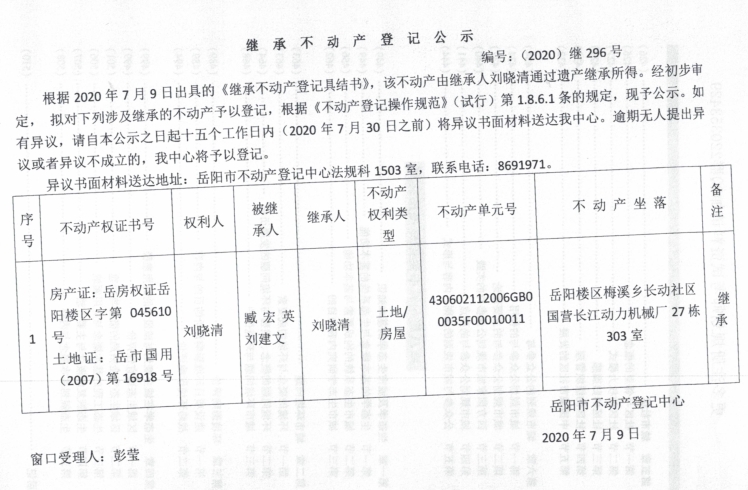 继承(受遗赠)不动产登记公告(刘晓清)