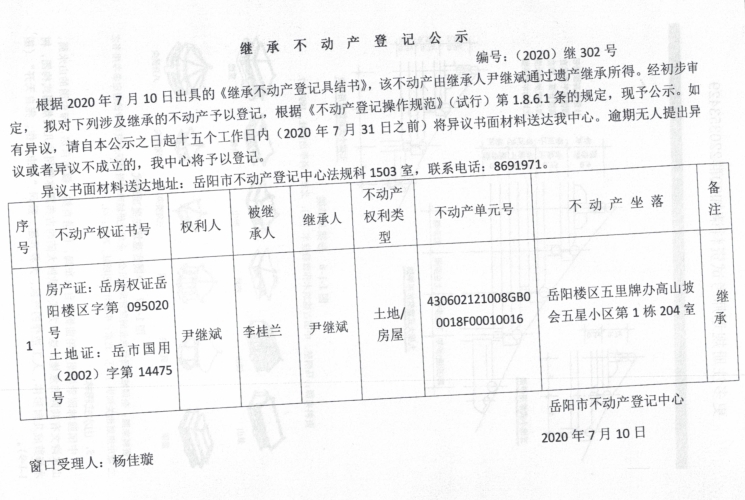 继承(受遗赠)不动产登记公告(尹继斌)