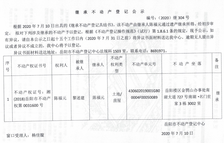 继承(受遗赠)不动产登记公告(陈福元)