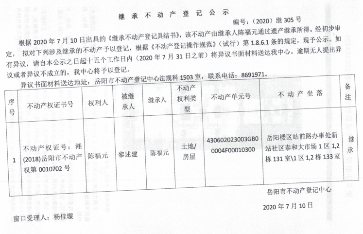 继承(受遗赠)不动产登记公告(陈福元)