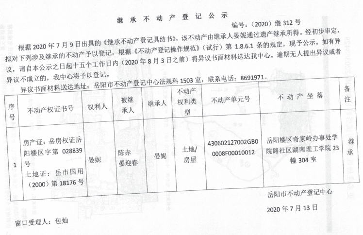 继承(受遗赠)不动产登记公告(晏妮)