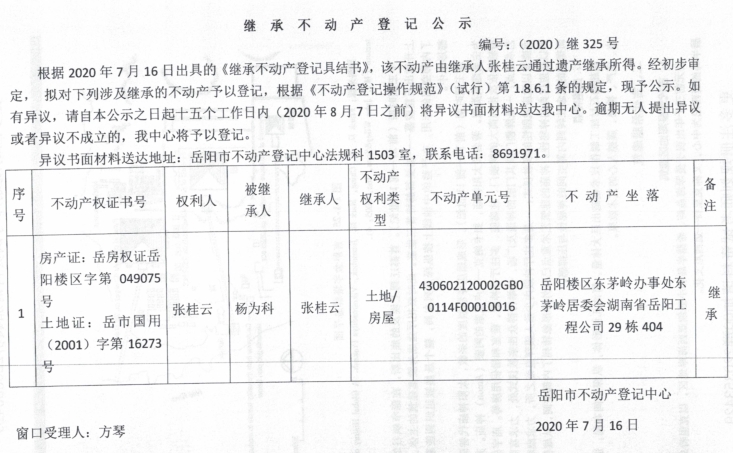 继承(受遗赠)不动产登记公告(张桂云)