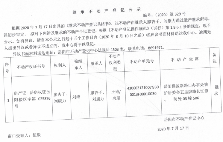 继承(受遗赠)不动产登记公告(刘康力)