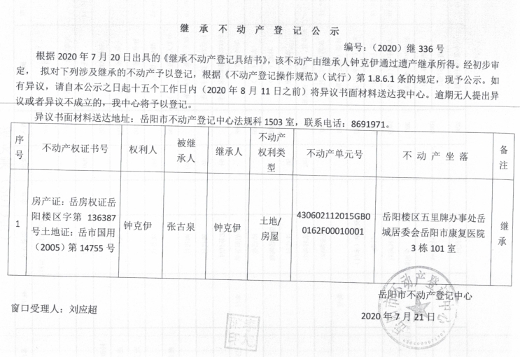 继承(受遗赠)不动产登记公告(钟克伊)