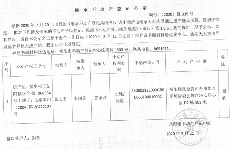继承(受遗赠)不动产登记公告(彭志君)