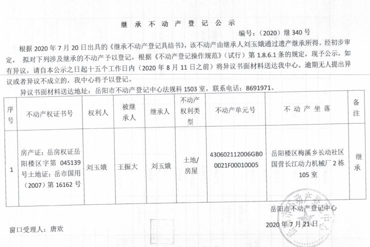 继承(受遗赠)不动产登记公告(刘玉娥)