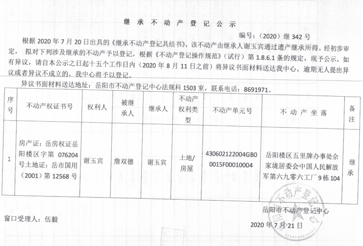 继承(受遗赠)不动产登记公告(谢玉宾)