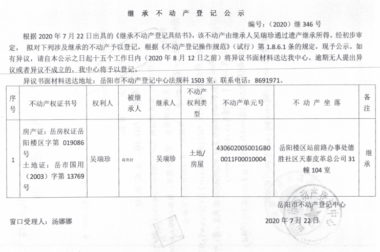 继承(受遗赠)不动产登记公告(吴瑞珍)