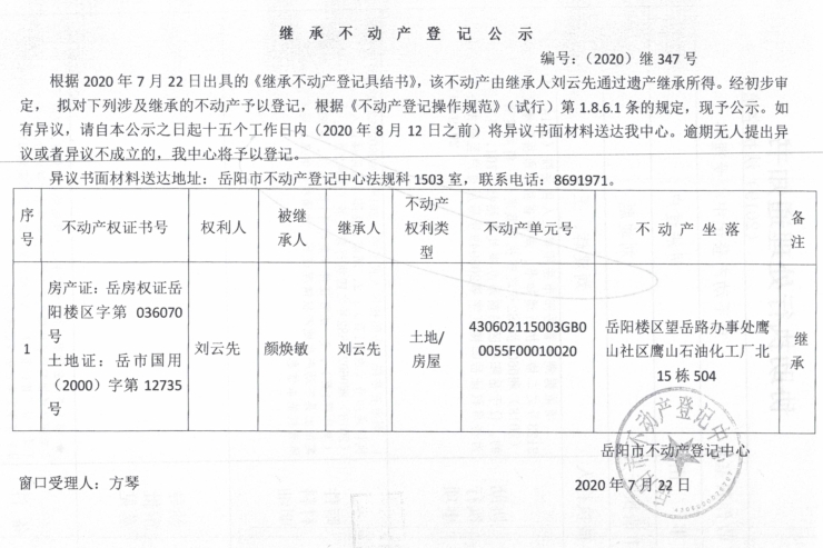 继承(受遗赠)不动产登记公告(刘云先)